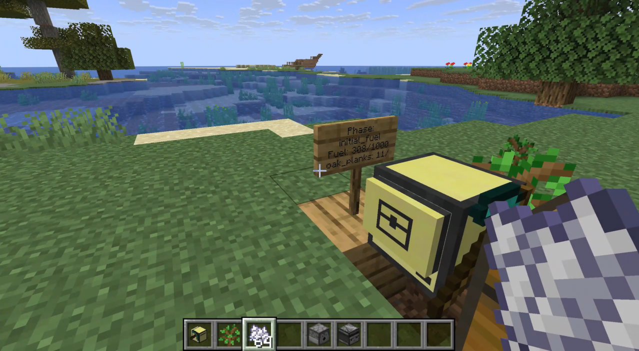 Continue to chop down trees until we build up enough planks and fuel for later phases. We also add a sign to the left, to update the player on where we're at (phase, fuel, material-gathering progress).