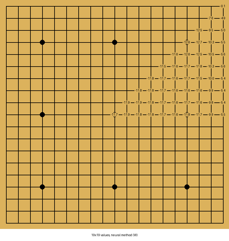 Our next question is, what are different starting moves worth? Well, let's just play every one and see what KataGo says the score is.
