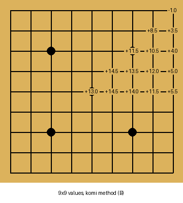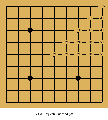 Note that all scores are relative to +6.5 for the empty board, which is why some values are negative.