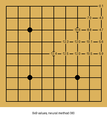 For the rest of the article, we're going to simplify, and only ask the value of board positions. We don't care which method we use, but I'll mark the fast-and-simple method as "neural", and the winrate method as "komi" or "winrate" in pictures.